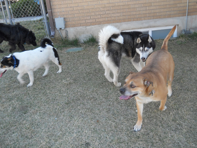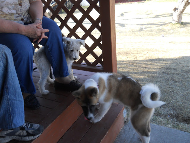 Thomas checks out Champ, while Boxy watches. The water bowl was a pretty popular place!
