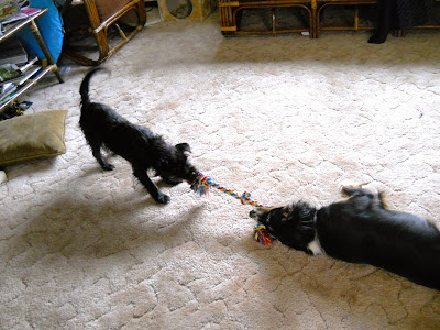 Now back to that all important issue of socialization. I know a lot of you out there are going to hear your vet tell you not to let your pup play with other dogs till the vaccination series is complete. Well, unless you have a Boxer, Pit Bull, Doberman, or Rottweiler, (those breeds were found to be more susceptible to Parvo) I would wait only a couple of days after your first round of shots. They will still have the antibodies from their mother's milk in their system to help protect them, and now you have just given those anti bodies a boost. Socialization is just as important, if not more so almost, than those vaccines you have just given. This is the age where their brain takes and processes as much information as possible. Now is the time they are hardwirering things for their future lifetime.